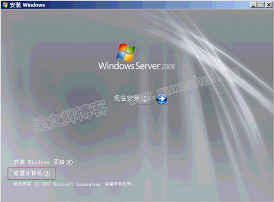 找一张2008的安装盘(版本、位数相同的),放入光驱,然后重启,从光盘启动。