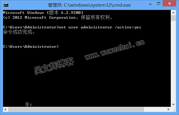 2、输入命令:net user administrator /active:yes,然后注销,即可用administrator登录。