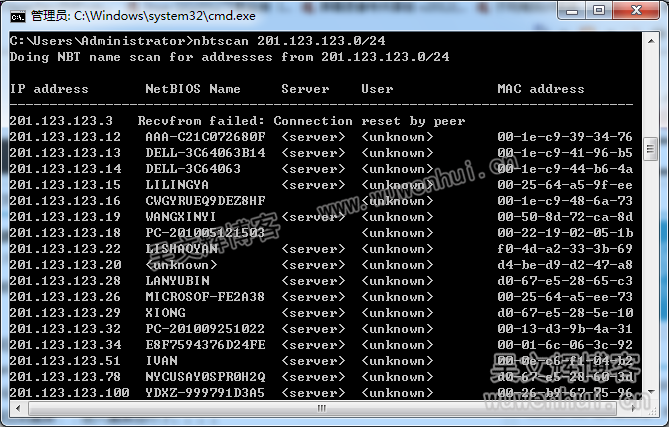 3、进入cmd窗口就可以输入命令:nbtscan 201.123.123.0/24(本机的IP为:201.123.123.X)。