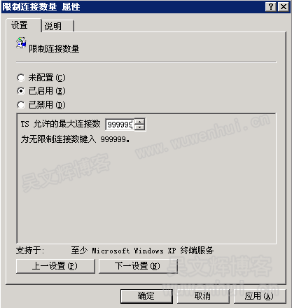 要解决这个问题,可在Windows Server 2003中打开“控制面板”→“管理工具”→“终端服务配置”,在打开窗口中选择“连接”,并双击右侧的“RDP-Tcp”选项,在弹出对话框中切换到“会话”标签,选择“替代用户设置”,并修改“结束已断开的会话”为“1分钟”。如问题未能解决,则可在“运行”栏中执行“gpedit.msc”命令,打开组策略编辑器,一次展开“计算机配置”→“管理模板”→“Windows组件”→“终端服务”,并双击右侧窗格中的“限制连接数量”策略,在弹出窗口中选择“已启用”,并设置“TS允许的最大连接数”为“999999”(如图),即可解除远程终端的连接数限制。