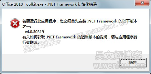 2、运行 Office 2010 Toolkit,此工具需安装 .net 4.0,如打开提示以下窗口,证明你的电脑未安装 .net 4.0,到百度下载安装把!