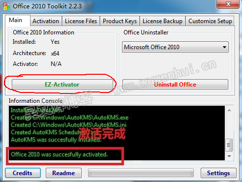 3、安装完 .net 4.0 后,打开 Office 2010 Toolkit,直接点击“EZ-Activator”,待底部显示“Office 2010 was succesfully activated”表示 Office 2010 已成功激活!