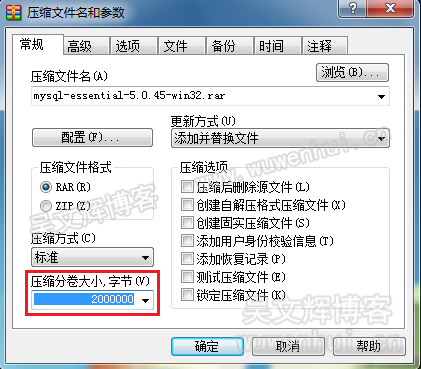 3、如图,在“压缩分卷大小,字节(V)”处填写每个分卷大小,这里是按字节算,大家可以根据自己的需要来填写。