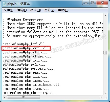 然后,我们在这个配置文件内,按Ctrl+F这个组合键,搜索curl,就会定位到curl的配置信息的地方,我们需要把前面的注释“;”这个符号去掉,然后保存,重启Apace的服务就可以进行安装了。