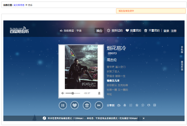 2、<iframe src=”http://fm.baidu.com” 指定IFRAME调用的文件,网址代表的就是酷狗电台的网页版,如果你喜欢其他音乐应用,你可以换成自己喜欢的,上面代码是百度随心听的,延伸说下,它还可以调用图片等(html,htm,gif,jepg,jpg,png,txt,*.*)