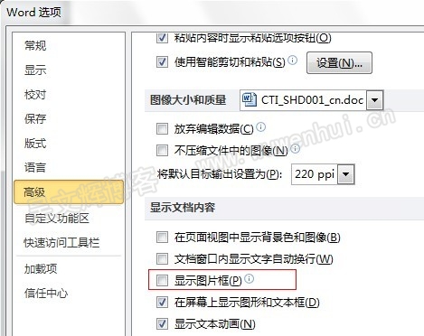 如果你发现你的Word 2007无法显示文档中保存的图片,只显示为一图片方框;而当插入新图片时也只显示方框。这是选项中图片设置的原因,选择了显示图片框选项,去掉就可以了~