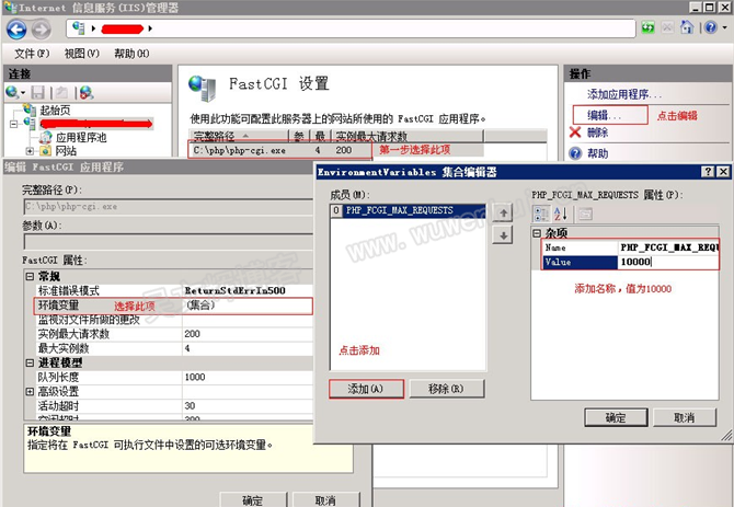 4、配置PHP“环境变量” PHP_FCGI_MAX_REQUESTS,取值设置为10000