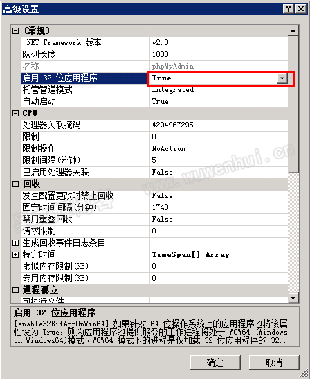 “应用程序池”–找到站点名称相同的程序池如“phpMyAdmin”–“高级设置”如图所示:
