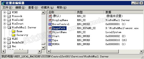 4、修改注册表中以下两处路径中ImagePath项为您所安装WinWebMail的实际路径: