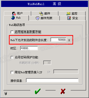 Winwebmail控制台程序->高级->Winwebmail->web->Web下发送的附件总长度50000K [50M]