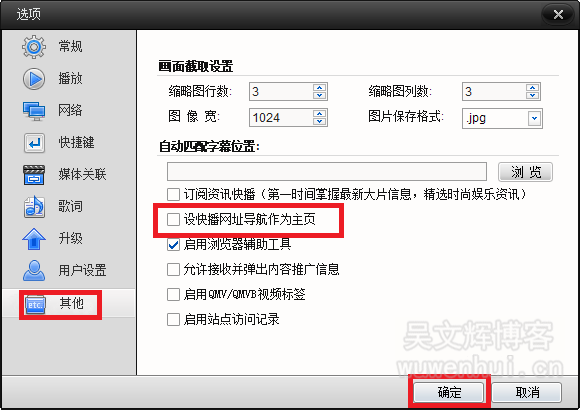 2.以管理员权限启动快播,在快播设置中取消主页。打开快播菜单->设置->选项(快捷键alt+o)中,选择其他,取消勾选 设置快播网址导航作为主页,最后点击确定。