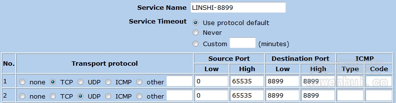 在Service Name处填写自定义的服务名称,在Transport protocol处选择需要使用的协议,在Destination Port 处填写自定义服务的目的端口,点击OK按钮提交操作。在上图中,我们添加了了一个名为LINSHI-8899的服务,它使用UDP协议,目的端口号为8899。