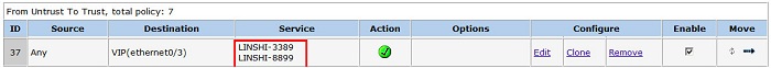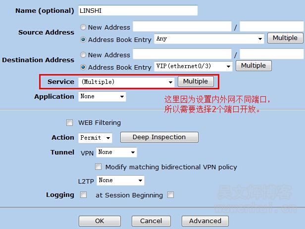 Source Address(源地址)从Address Book Entry中选择Any,Destination Address(目的地址)从Address Book Entry中选择相关的VIP服务,Service选择自定义的服务。图中目的地址我们选择了之前添加的VIP(ethernet0/3),Service我这里选择的是多个端口服务,因为我是设置内外网不同端口映射,就需要开放2个端口,完成后,点击OK按钮提交。