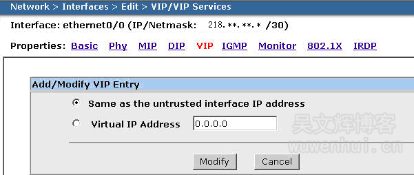 初次添加VIP设置时,如果你有多个外网IP地址,你可以选择填入你的Virtual IP Address,如果ISP只提供给你一个外网IP地址或者你通过PPPOE方式获得外网IP,你可以选择Same as the untrusted interface IP address,点击Add按钮提交。