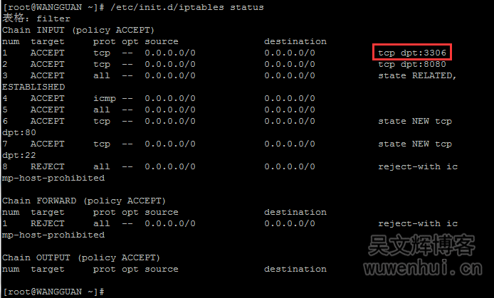 第2步:使用“/etc/init.d/iptables status”命令可查看刚刚添加到防火墙例外的端口信息。