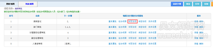 3、选择“列表视图”,找到对应需要修改的步骤,点击“可写字段”,我想限制的是第一步。
