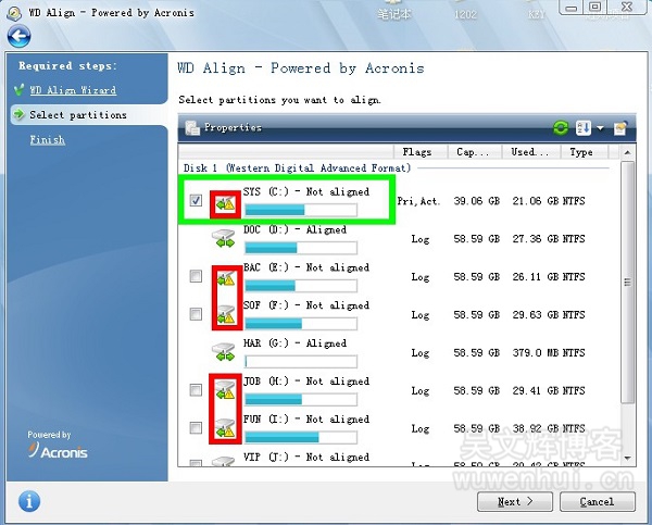 安装WD align后,打开程序,程序会自动搜索未对齐分区,如图,打感叹号的为需要对齐分区,勾选修复就行了,启动在也不慢了,哈哈~