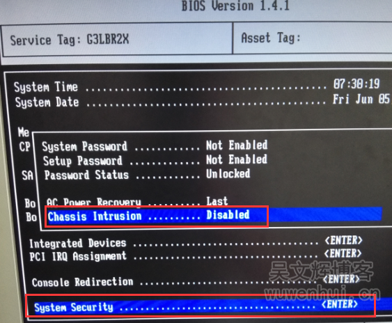 F2进入bios,找到“System Security”进入,按下箭头键移至“Chassis Intrusion”(机箱防盗)选项,修改选项为“Disabled”禁用,下面附选项说明!