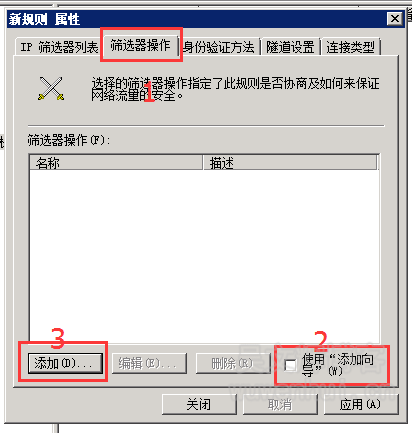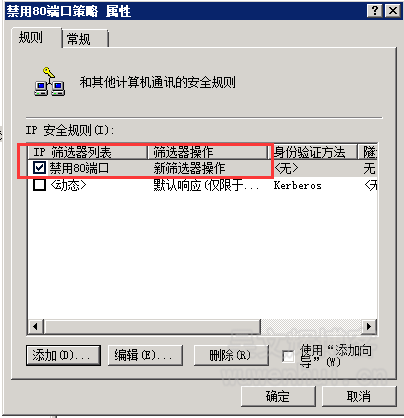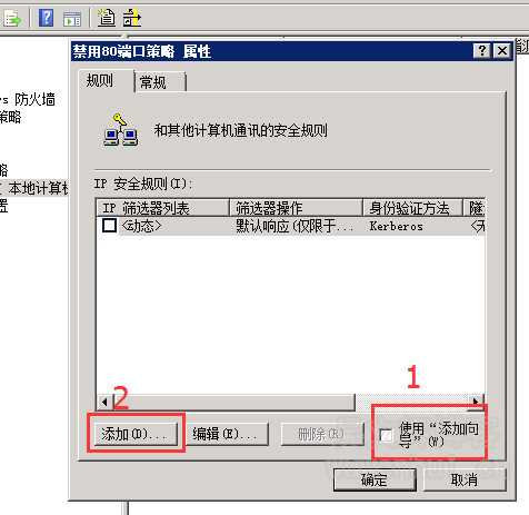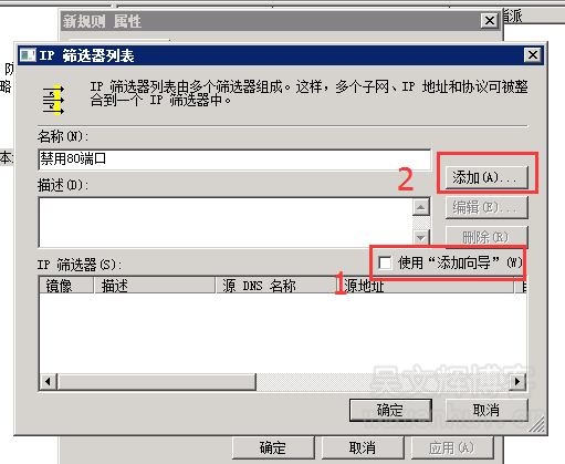 3、系统弹出“属性”对话框。取消右下角“使用添加向导”的勾选,然后再点击“添加”,随后弹出“新规则属性”对话框,点击“添加”,又弹出了“IP筛选列表”,填写名称“禁用80端口”,在页面中取消“使用添加向导”的勾选,然后点“添加”,将弹出“IP筛选器属性”。