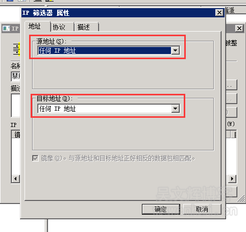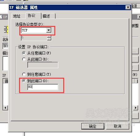 4、进入“筛选器属性”对话框,源地址选“任何IP地址”,目标地址选“任何IP地址或者我的IP地址(这个看个人需求)”。接下来点击“协议”选项卡,在“选择协议类型”中选择“TCP”,到此端口填“80”,接着点击“描述”选项卡,填写描述“禁用80”,点击“确定”。