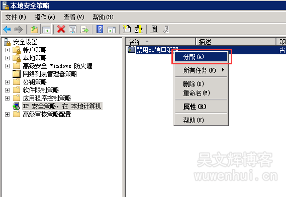 6、最后“新IP安全策略属性”对话框,在“禁用80端口策略”左边打钩,按确定关闭对话框。在“本地安全策略”窗口,鼠标右键新添加的IP安全策略,然后选择“分配”。