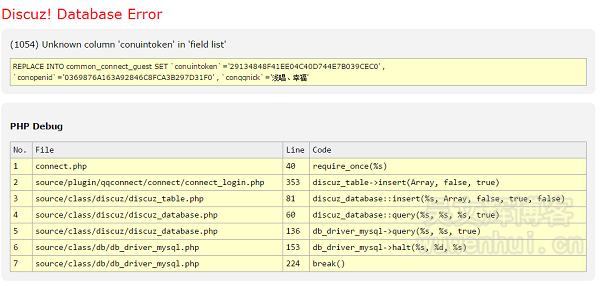 这个可能很多人都看到了吧,其实就是数据表common_member_connect少了一个字段conuintoken。添加好就行,字段约束 为char(32)。