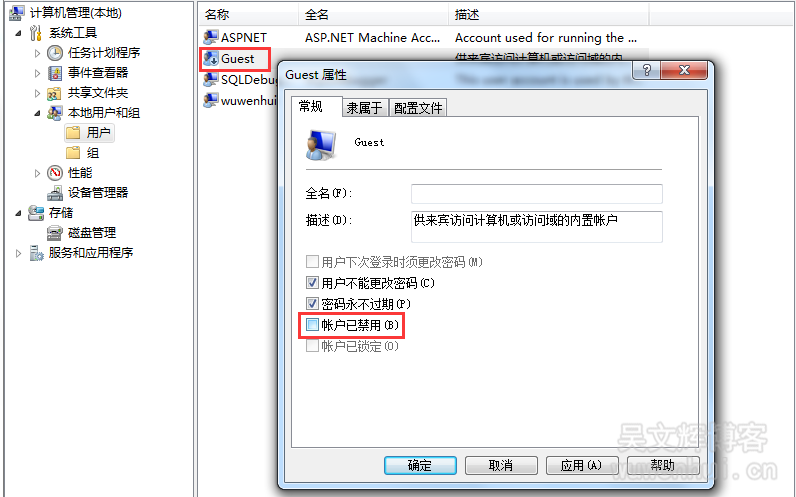 方法二:我的电脑按右键–管理–本地用户和组–用户,右边的方框guest按右键–属性–把帐户已停用的钩取消即可。