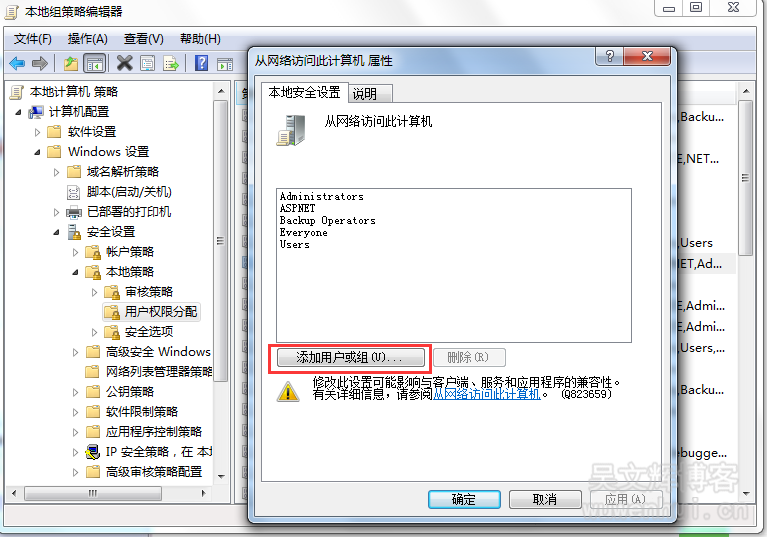 打开控制面板–管理工具–本地安全策略–本地策略或者开始–运行gpedit.msc打开组策略,找到【计算机配置】-【Windows设置】-【安全设置】-【本地策略】-【用户权限分配】,在右边的策略中找到”从网络访问此计算机” ,打开后把可以访问此计算机的用户或组添加进来。