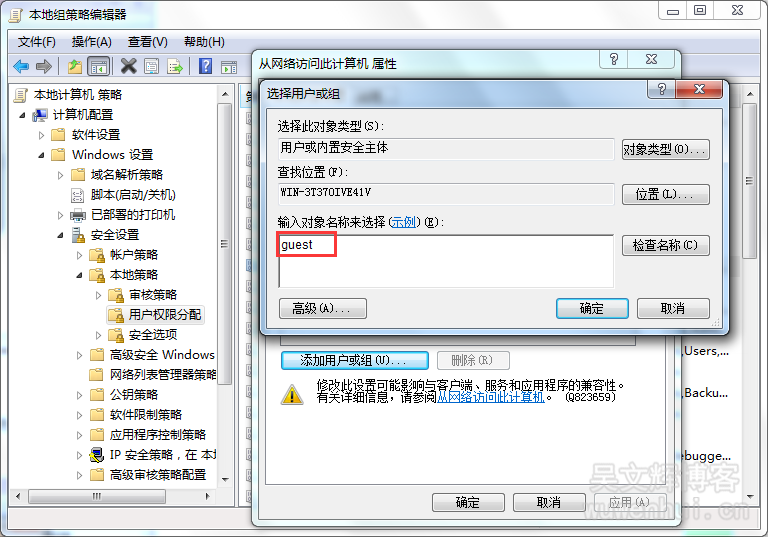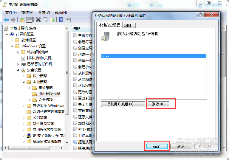 4、点【用户权限分配】,在右边的策略中找到“拒绝从网络访问这台计算机”,把guest删除、保存即可。