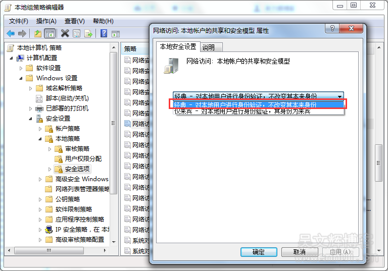5、统登录窗口默认以guest用户登录,无法更改时,点【本地策略】-【安全选项】,更改策略“网络访问: 本地帐户的共享和安全模式” ,为经典模式 即可。