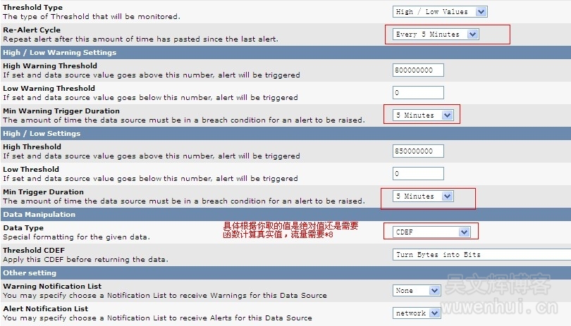 4、Templates->Threshold Templates,可以添加、取出需要关联到预警系统的模板,例如:可以添加和“interface-Traffic”模板的关联,如“traffic_in”、“traffic_out”数据项,分别设置警告阈值“High Threshold”(如200000000比特/秒);