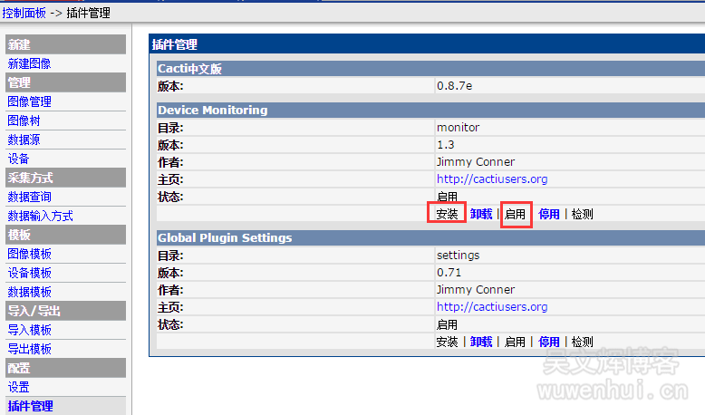 2、完成后访问Cacti页面,【控制面板】-【配置】-【插件管理】,点【安装】在点【启用】就可以了。