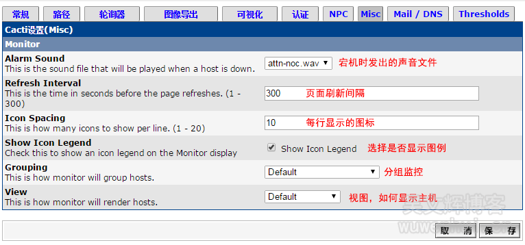 在【控制面板】选项卡下,点击左侧菜单中的【设置】链接,在右侧出现的web页中点击Misc选项卡来配置Monitor插件。