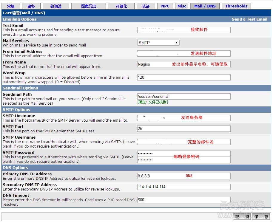 网上大牛建议mail servers选择smtp,并正确设置smtp和dns信息。因为无论选择phpmail还是sendmail都要使用sendmail这程序,都要装一个邮件系统。没有必要吧,多一个程序多一个风险。设置完了可以点一下右上角的”Send a Test Email”以确定配置正确)