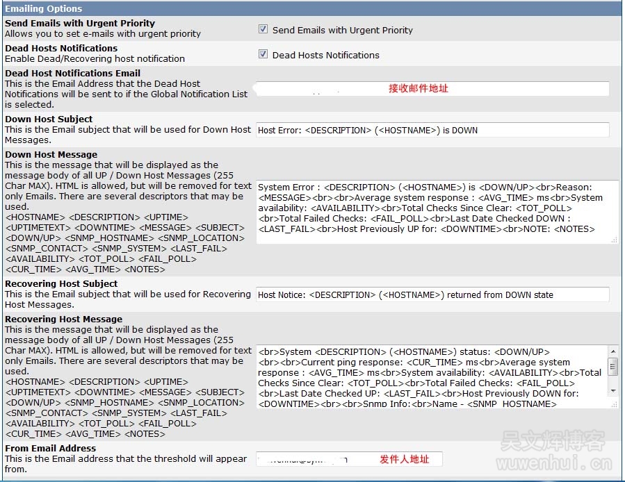 2、控制面板->设置->Alerting/Thold配置出现问题的时候有邮件通知,Alerting /Thold可以调整Thold的各项配置。例如:“Dead Host Notifications Email”处可填写设备宕机时发送警告信息到哪个邮箱;勾选“Send alerts as text”项,设置只发送文本格式的邮件。在”Default Alerting Options”里,启用”Dead Hosts Notificatios”并正确填写警告的邮件地址: