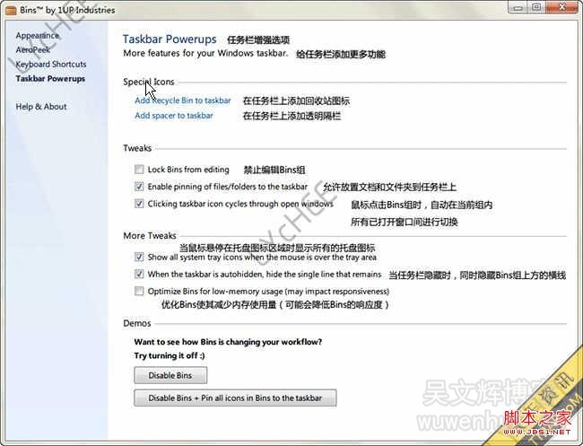 Bins 是一个软件,基本上是令 Windows7 的工作列加上MacOS X中的Stack 功能。如果你的工作列上有十分多的程序,不防试试用Bins来整理一下。Bins使用很简单,你只要安装它,然后拖动一个程序图标在任务栏到另一个程序图 标在任务栏上,你就可以创建一个 bin。