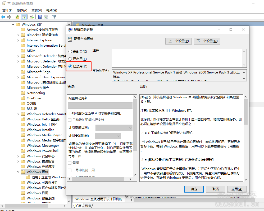 3、然后在右侧“配置自动更新”设置中,将其设置为“已禁用”并点击下方的“应用”然后“确定”。