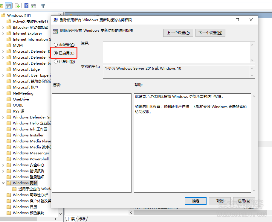 4、之后还需要再找到“删除使用所有Windows更新功能的访问权限”,选择已启用,完成设置后,点击“应用”“确定”。