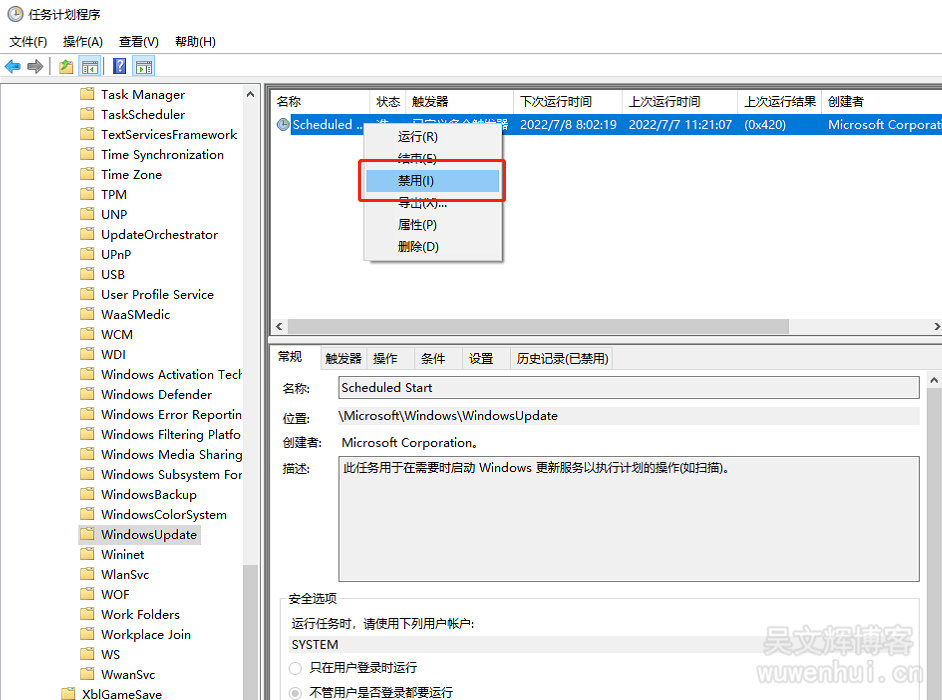 2、在任务计划程序的设置界面,依次展开 任务计划程序库 -> Microsoft -> Windows -> WindowsUpdate,把里面的项目都设置为 [ 禁用 ] 就可以了。(我这里边只有一个任务,你的电脑里可能会有2个或者更多,全部禁用就行了)
