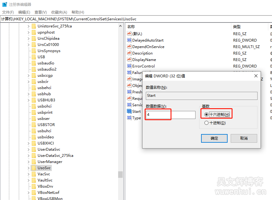 2、在注册表设置中,找到并定位到 [HKEY_LOCAL_MACHINE\SYSTEM\CurrentControlSet\Services\UsoSvc]。然后在右侧找到“Start”键。
