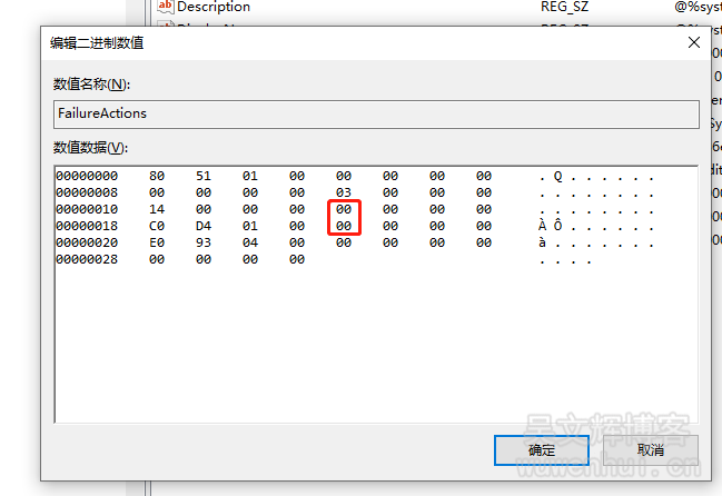 4、继续在右侧找到“FailureActions”键,右键点击修改该键的二进制数据,将“0010”、“0018”行的左起第5个数值由原来的“01”改为“00”,完成后,点击下方的“确定”即可。