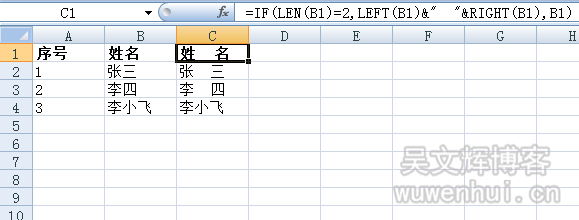 在姓名右边插入列,如在B列,加入公式:=IF(LEN(B1)=2,LEFT(B1)&” “&RIGHT(B1),B1)