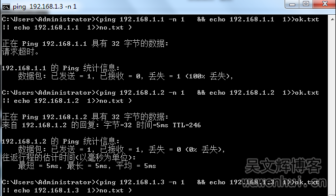 for /l %D in (1,1,255) do (ping 192.168.1.%D -n 1 && echo 192.168.1.%D>>ok.txt || echo 192.168.1.%D >>no.txt)