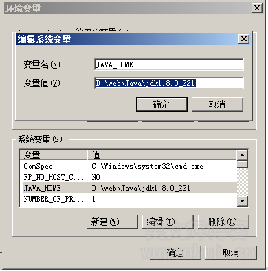 5、新建JAVA_HOME变量,变量名(JAVA_HOME)变量值(D:\web\Java\jdk1.8.0_221)。