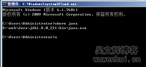 7、检查是否配置成功,打开命令提示符输入where java 检查java安装目录,如果是刚才的安装目录,说明安装正确。