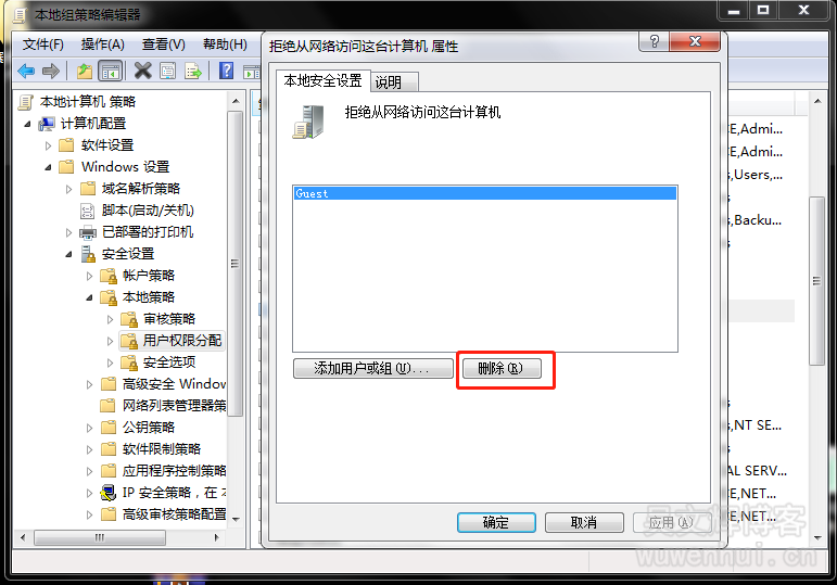 2、在弹出的窗口中依次展开:计算机配置—-windows设置—-安全设置—-本地策略—-用户权限分配—-拒绝从网络访问这台计算机,双击点开拒绝从网络访问这台计算机这个策略,删除里面的guest用户;