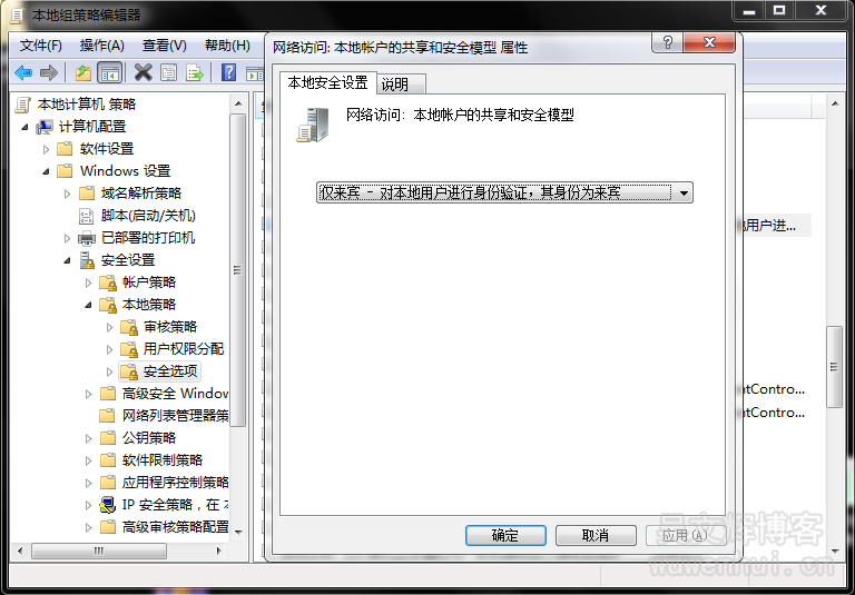 3、再依次展开:计算机配置—-windows设置—-安全设置—-本地策略—-安全选项—-网络访问: 本地帐户的共享和安全模型双击点开把访问类型改为:仅来宾 – 对本地用户进行身份验证,其身份为来宾。