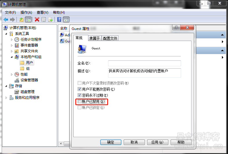 4、在桌面上点击我的电脑—管理;展开—系统工具—本地用户和组—-用户—启用Guest这个用户,在Guest上右键—-属性—-去掉帐户已禁用的勾;(如Guest用户有密码,需要取消密码)
