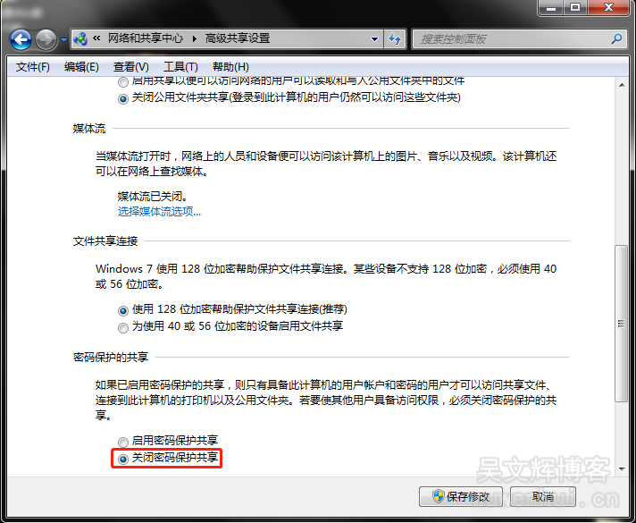 5、在网络和共享中心中打开“选择家庭和共享选项”—-“更改高级共享设置”关闭密码访问共享。