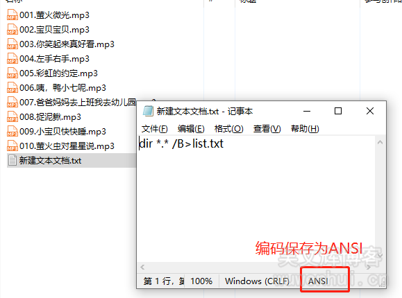 2、然后在新建文本文档中输入以下命令, dir *.* /B>list.txt,另存编码选择ANSI,这里解释一下这个命令: